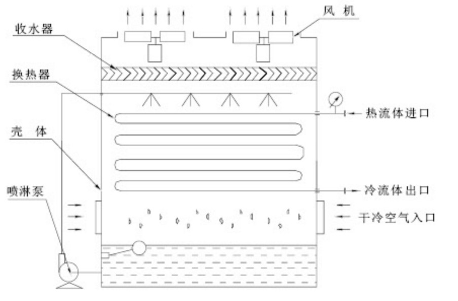 工作時(shí),載熱介質(zhì)(冷卻水、油或其他液體)由系統(tǒng)循環(huán)泵驅(qū)動(dòng),在換熱器盤(pán)管內(nèi)及需冷卻設(shè)備(如∶電源、爐體等)之間循環(huán)流動(dòng),載熱介質(zhì)熱量向盤(pán)管管壁傳導(dǎo)。噴淋水均勻地噴灑在換熱器上,在換熱器盤(pán)管外表面形成均勻的水膜。在風(fēng)機(jī)的作用下,冷空氣由塔體下方的進(jìn)風(fēng)口進(jìn)入塔內(nèi),與噴淋水逆流經(jīng)過(guò)換熱器表面,充分接觸,并進(jìn)行潛熱和顯熱交換,部分水蒸發(fā),使噴淋水溫降低,吸收熱量后的飽和濕熱空氣由風(fēng)機(jī)排至大氣中,低溫噴淋水吸收盤(pán)管熱量后流入塔體下部水槽,再由噴淋泵再輸送至噴淋系統(tǒng)。如此往復(fù),換熱器內(nèi)的載熱介質(zhì)得到降溫冷卻。在熱交換過(guò)程中,盤(pán)管內(nèi)的載熱介質(zhì)因?yàn)闆](méi)有與空氣直接接觸,使得品質(zhì)特性得以保持,不會(huì)污染、濃縮、吸濕及揮發(fā)。